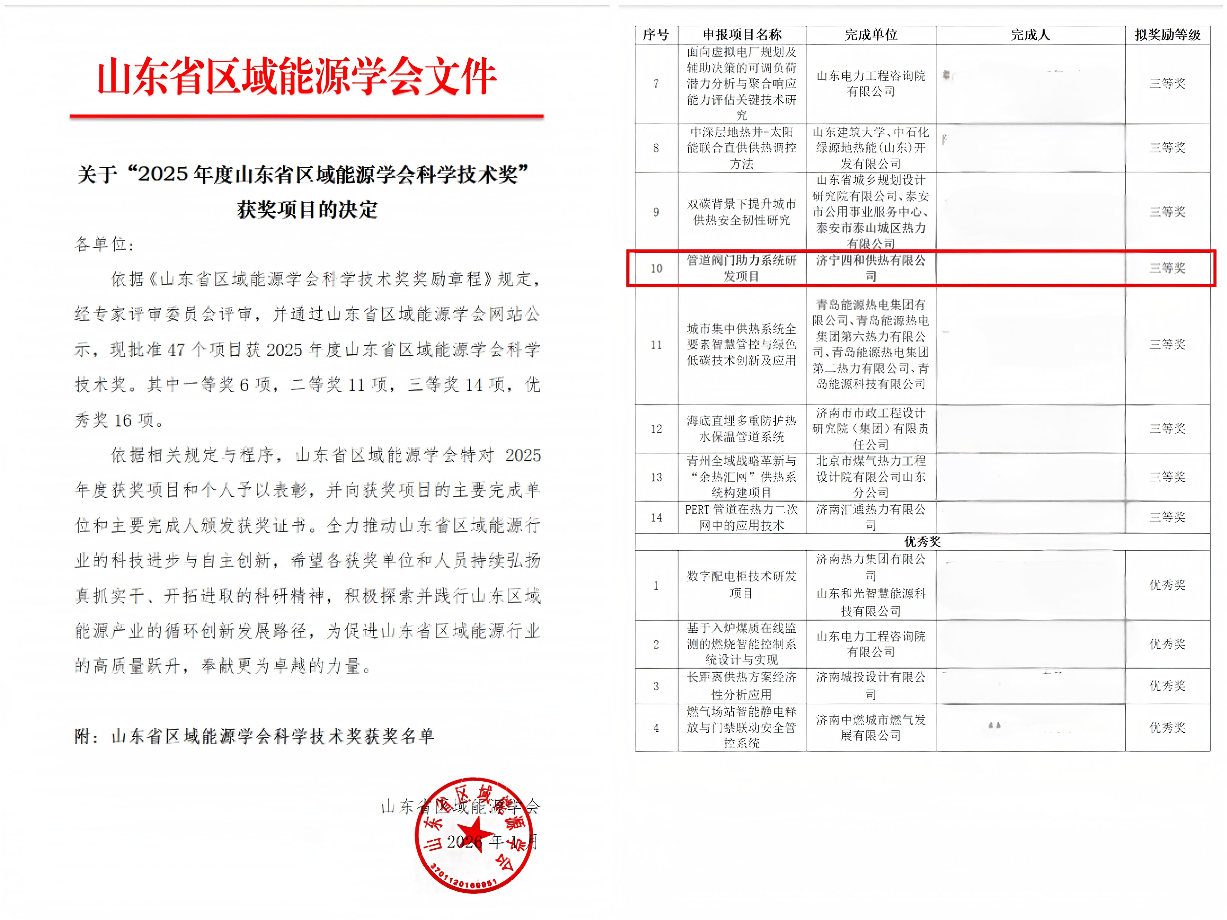 近日,2025年度山东省区域能源学会科学技术奖获奖项目名单正式公示,济宁四和供热有限公司自主研发的管道阀门助力系统项目凭借突出的技术创新与应用价值,成功获得科学技术奖三等奖,这是对四和供热公司技术研发实力和成果转化能力的高度认可。